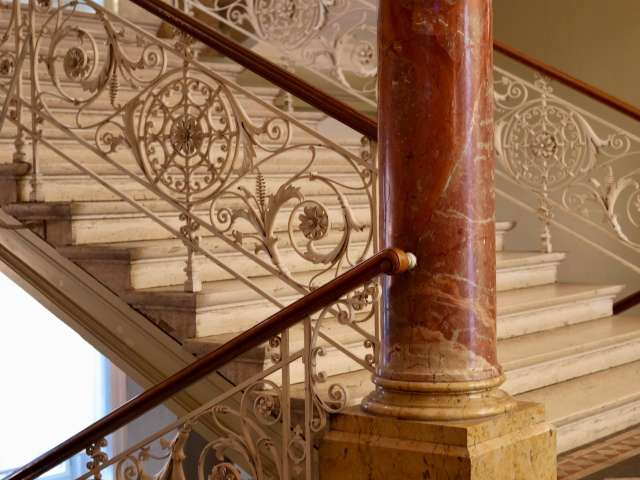 The four-storey brick building is 40 meters long and begins with the mezzanine floor on a half-storey granite base. The fourth floor is set back behind the roof cornice, emphasizing the tower shape of the building. The building, which was designed by Zurich architect Gustav Gull, is also known as the “Palazzo Rosso” due to its red brick façade.