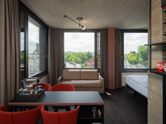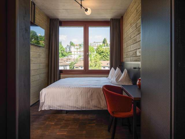 The Tailormade Hotel LEO St.Gallen was designed by the renowned architect Roger Boltshauser and is located directly at the train station St.Gallen in close proximity to the highway connection St.Gallen City. Timeless design with organic materials such as adobe and solid wood characterize the image of the elegant building right next to the Lokremise.
