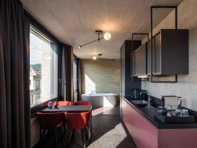 On the roof, a roof terrace and a small wellness area with sauna, workout room and hot tub invite you to linger.