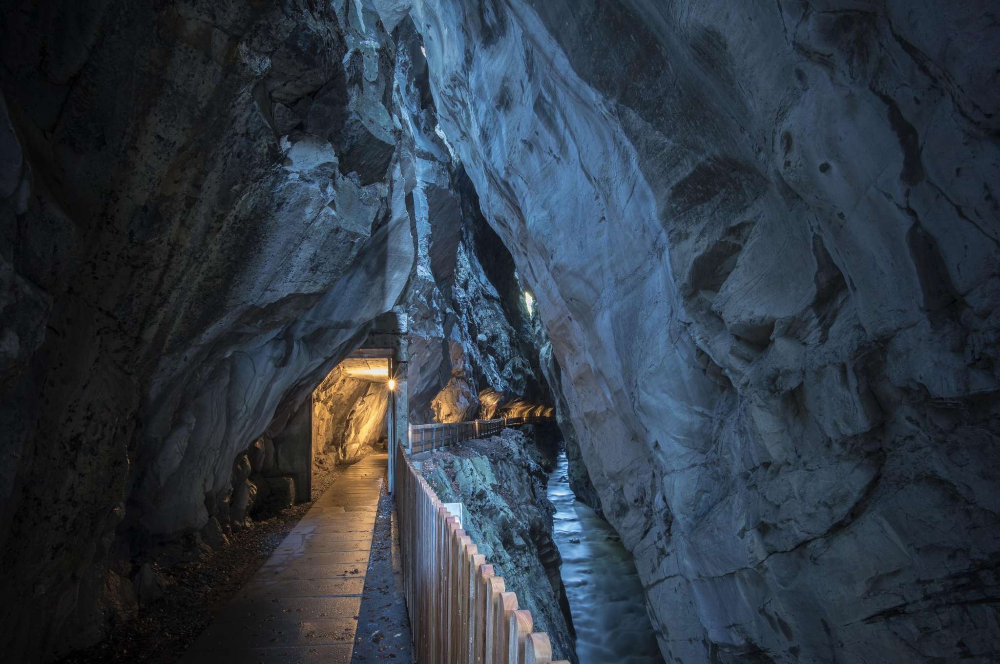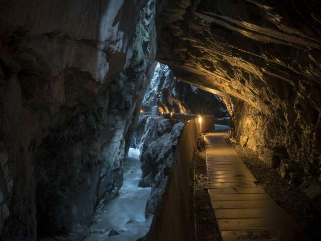 The Tamina Gorge near Bad Ragaz offers a 450-meter long, safe path to the spring water grotto. Here, 8000 liters of thermal water per minute gush from Europe's most productive akratotherm, with a constant temperature of 36.5 °C.