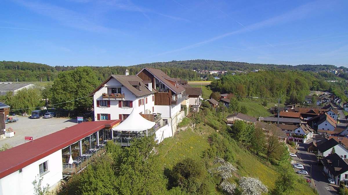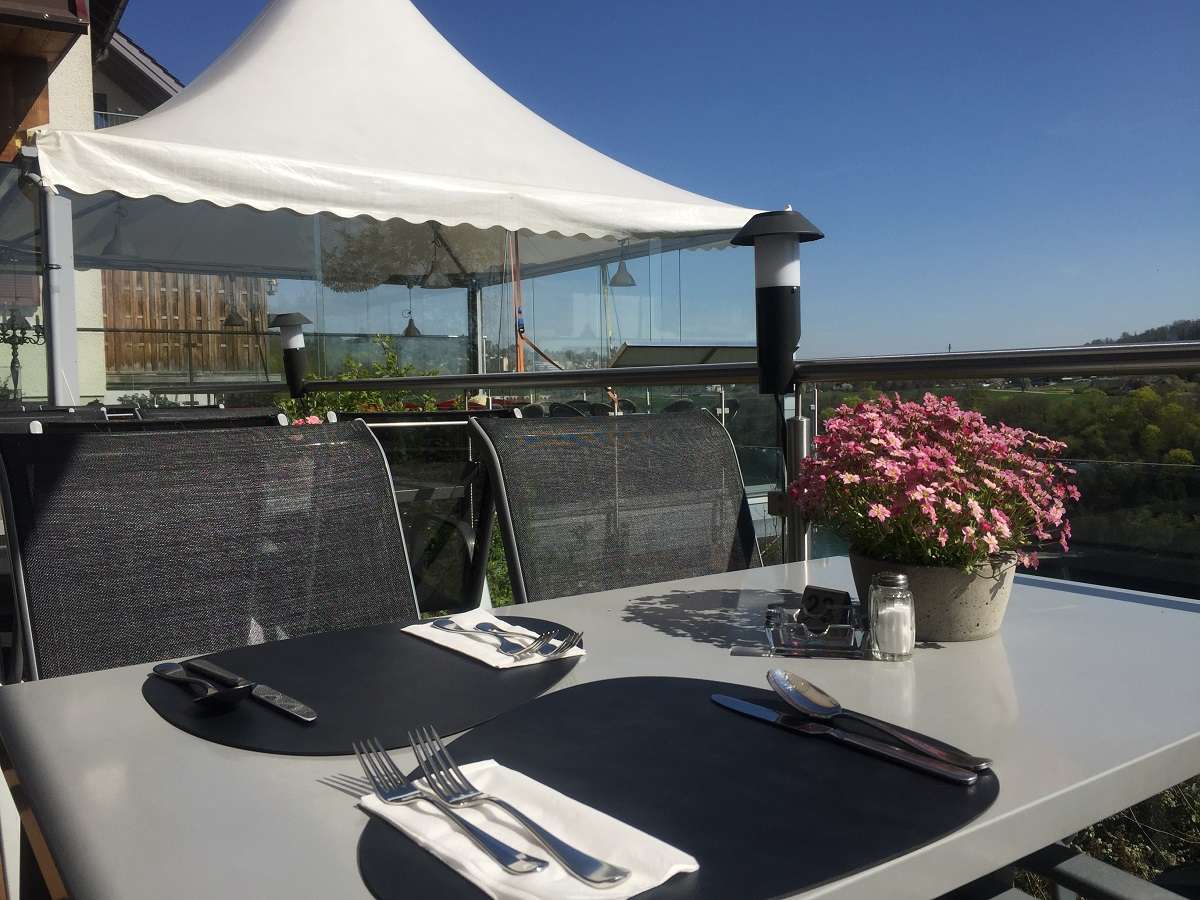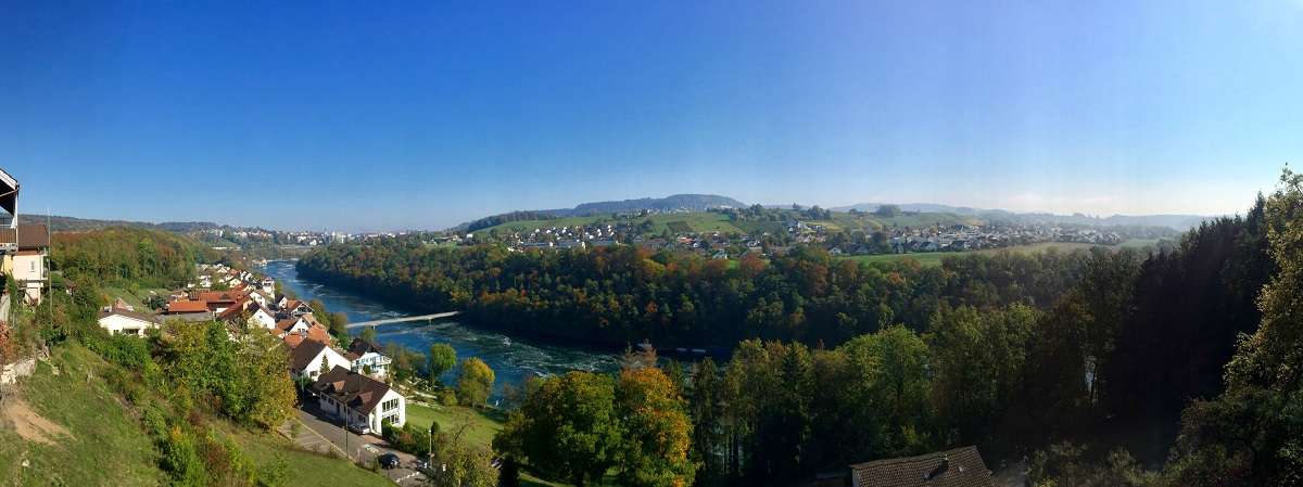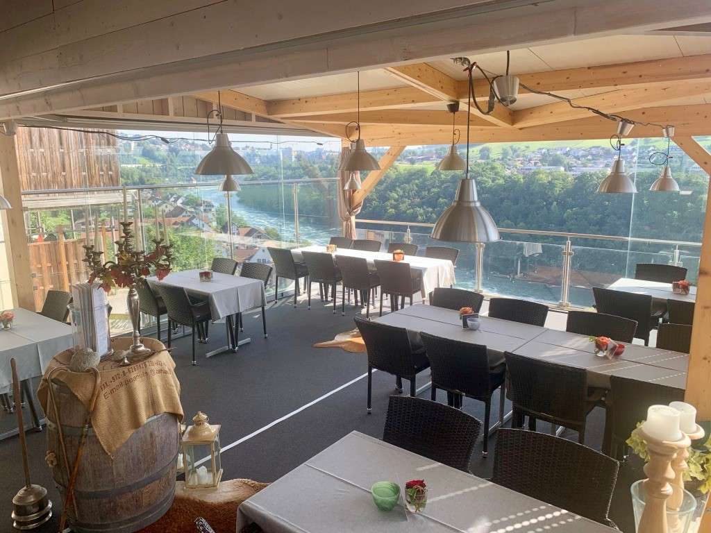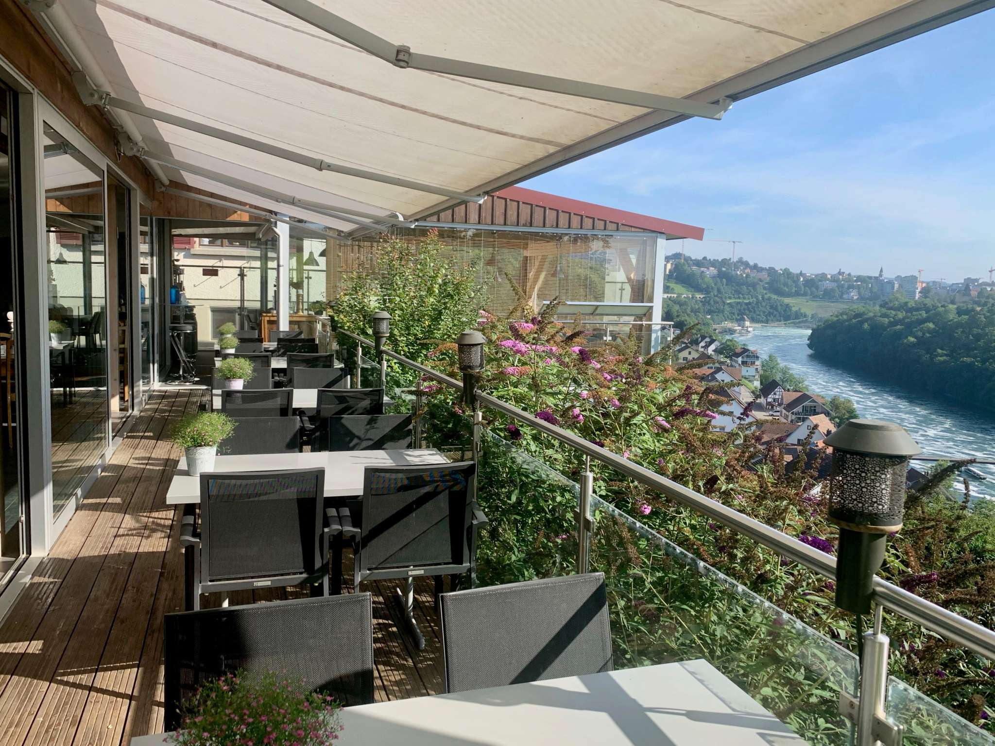 A view from the terrace offers a magnificent view of the Rhine all the way to the Rhine Falls basin. The panorama also offers a view of the surrounding hills and, on a clear day, even the Alps.