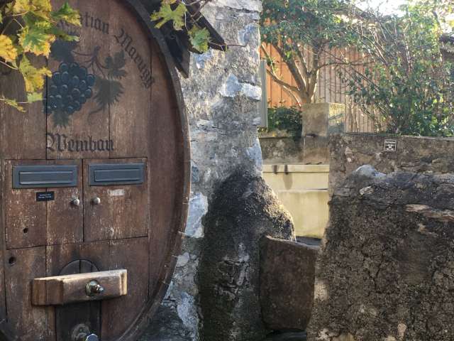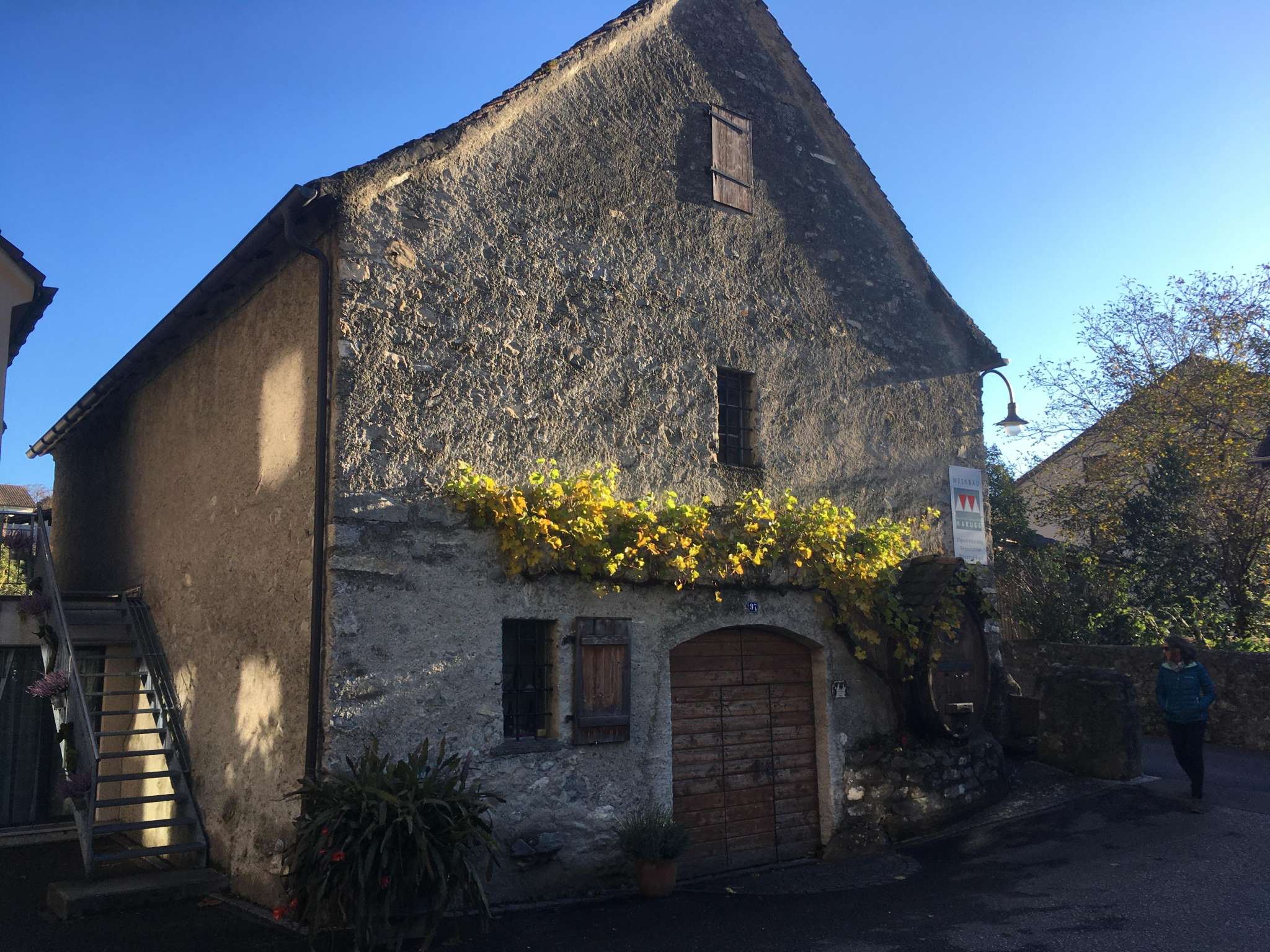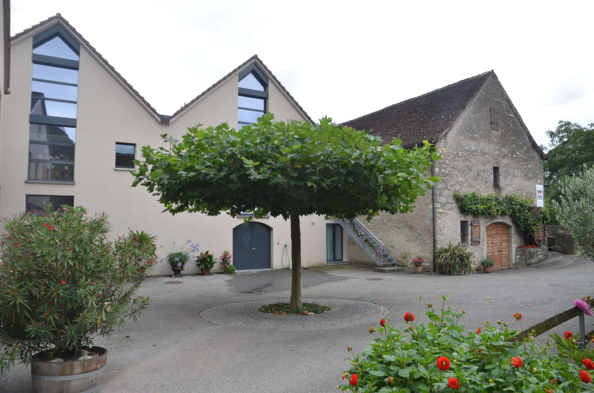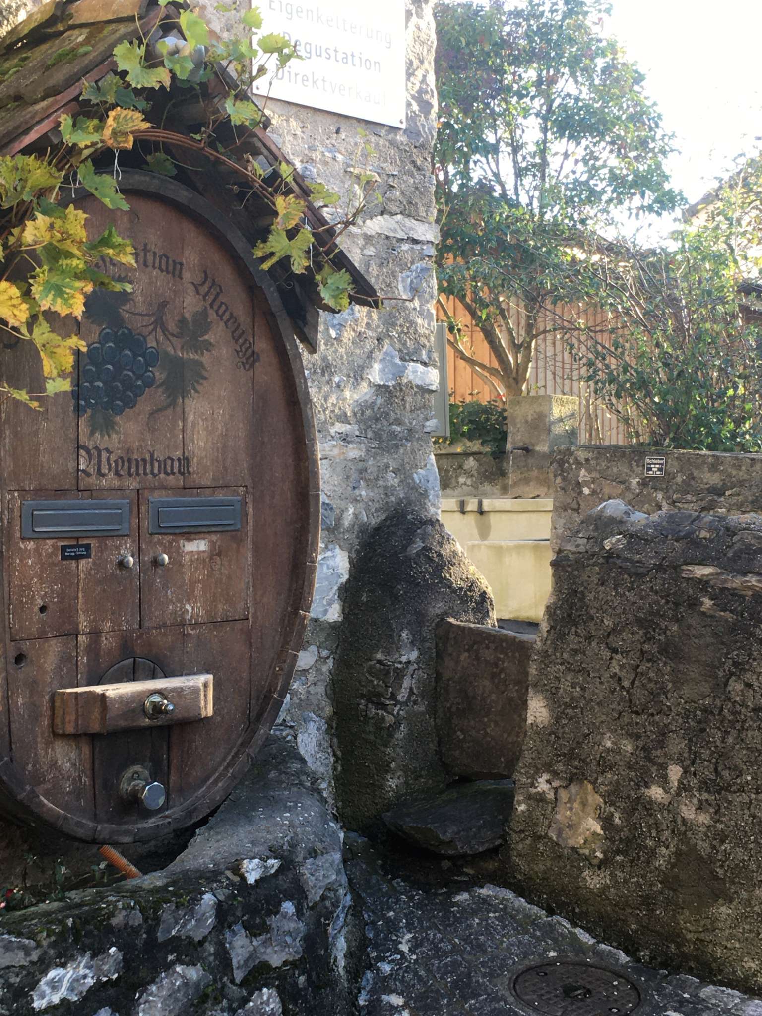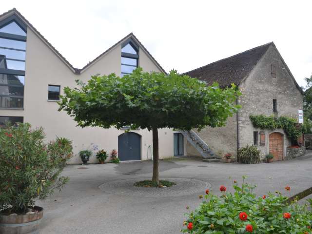 The three-storey winepress (a so-called “Torkel”) stands in a prominent position, marking the upper end of the historic village centre. The gate dates from the same period as the wine-press’ tree trunk from 1691, which has since been removed; it was used to press grapes as well as fruit. The roof structure was rebuilt after the village fire of 1820. Some of the interior fittings are still from the building period. Note the "Stäpfli" facing the alley.
