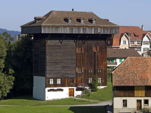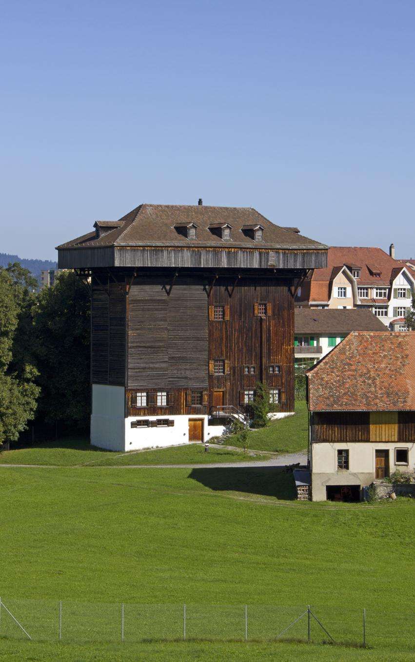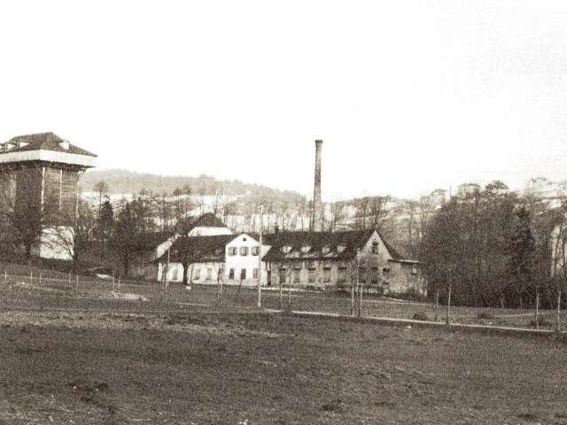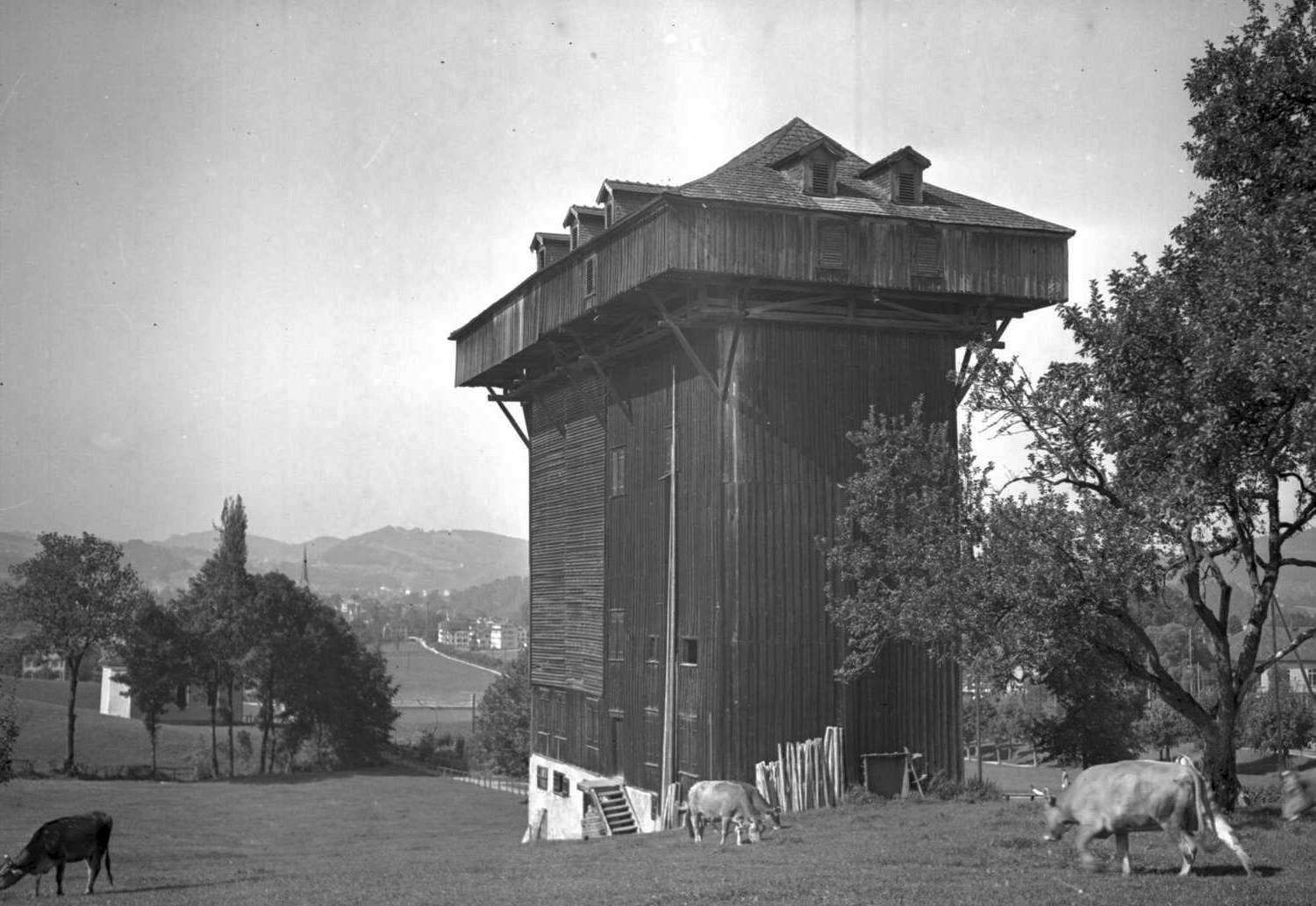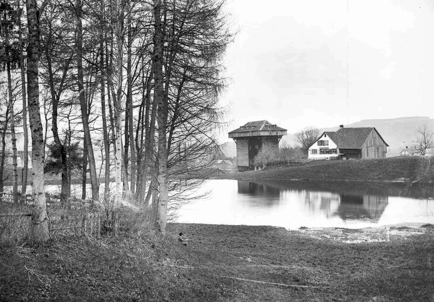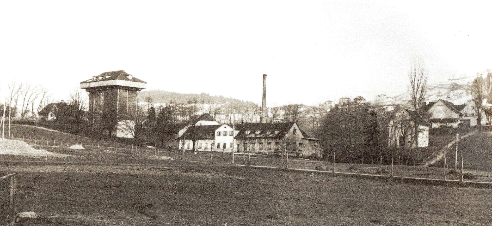 The drying tower and surrounding ponds are among the most striking architectural monuments from the heyday of the textile industry in eastern Switzerland.