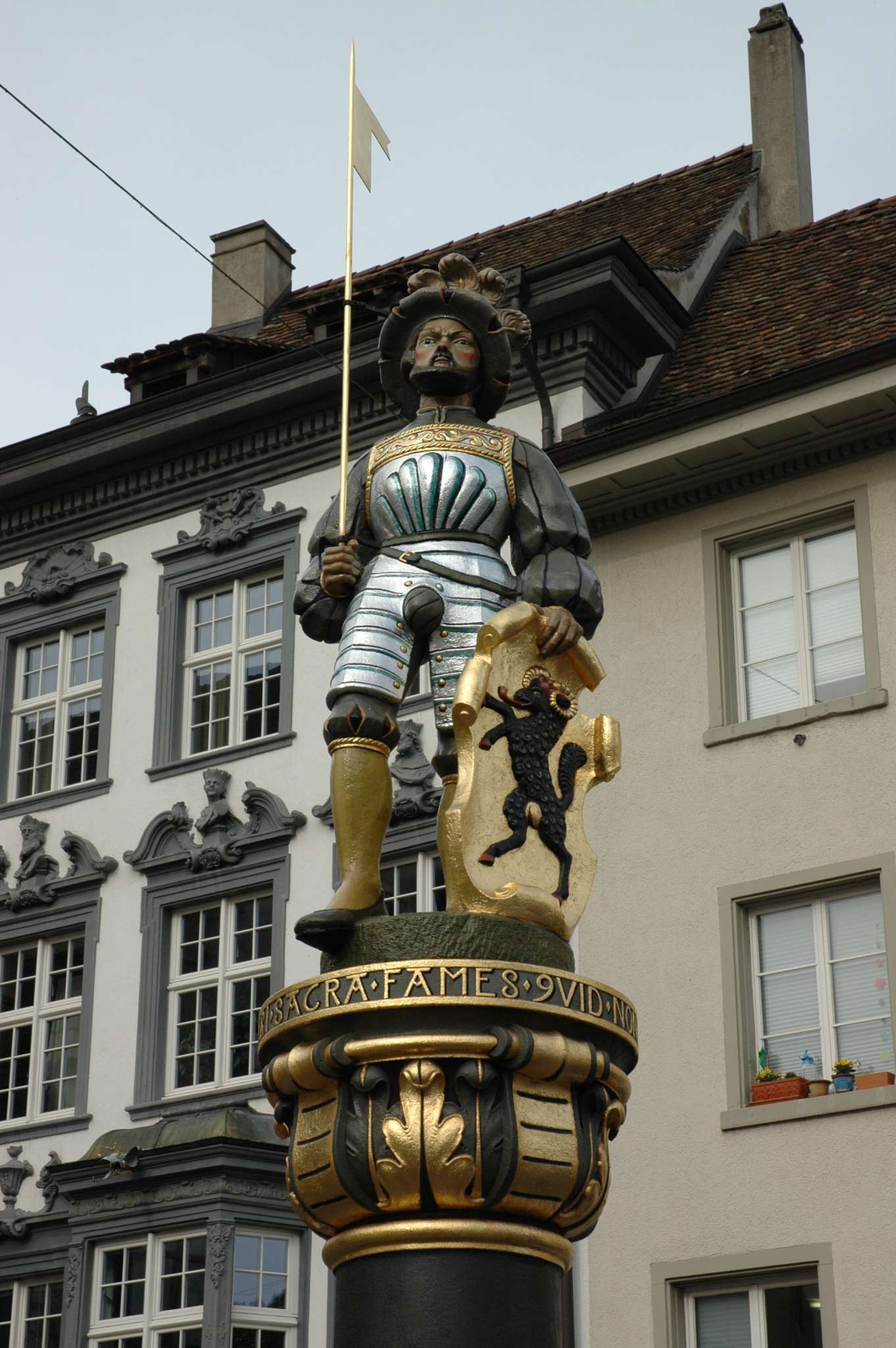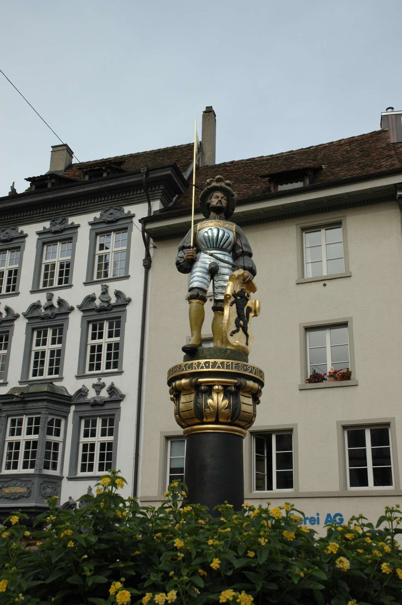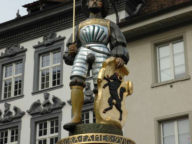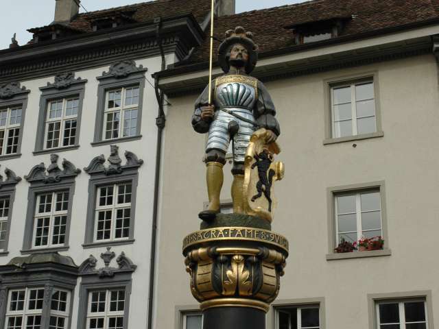The fountain on Walther-Bringolf-Square is over 400 years old. It was probably created in 1596 and remodeled in the 18th century. The column with the Landsknecht figure is a copy of the statue from the Fischmarkt fountain, which was demolished in 1840, and has adorned the Walther-Bringolf-Square fountain since 1925.