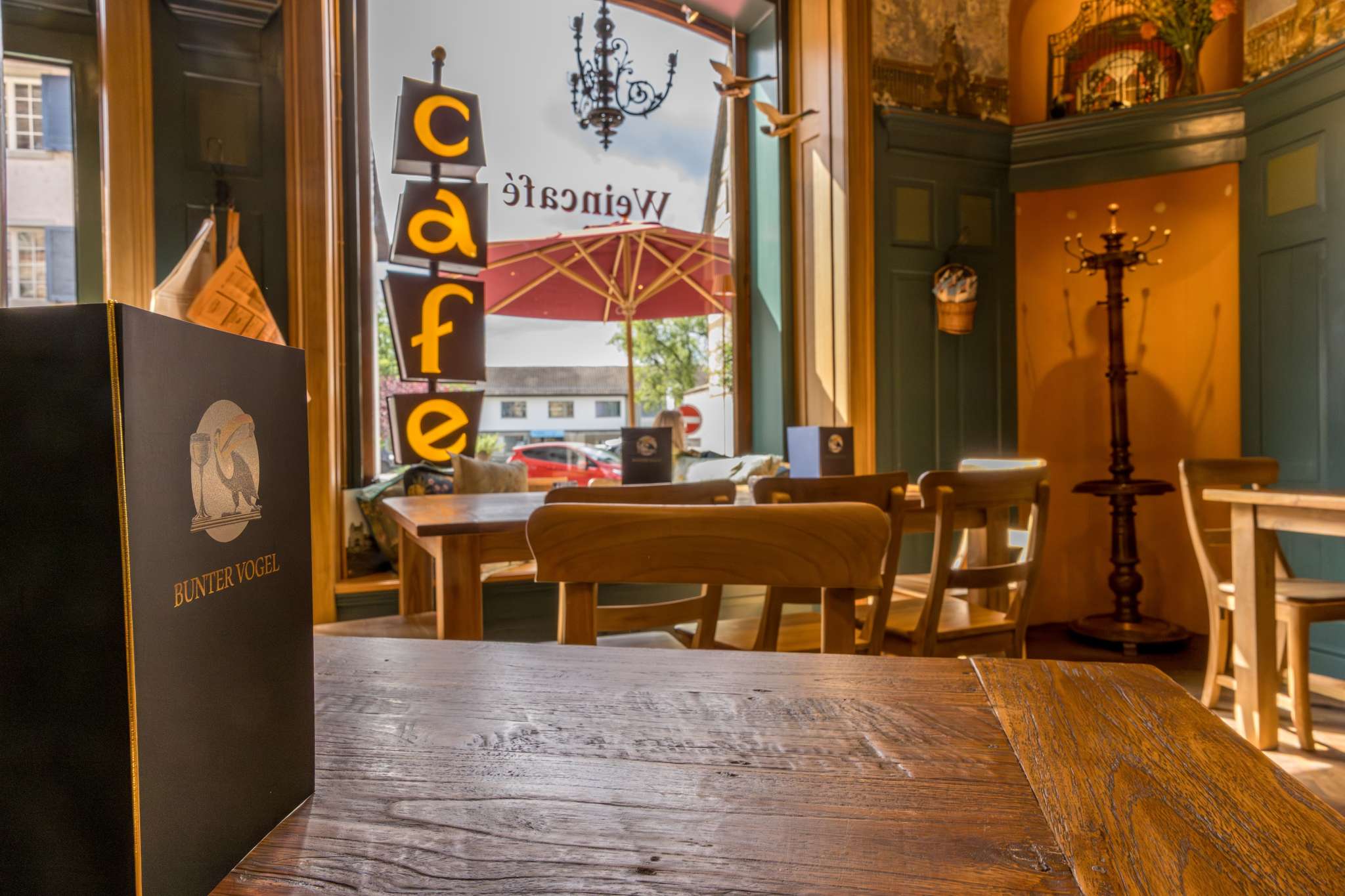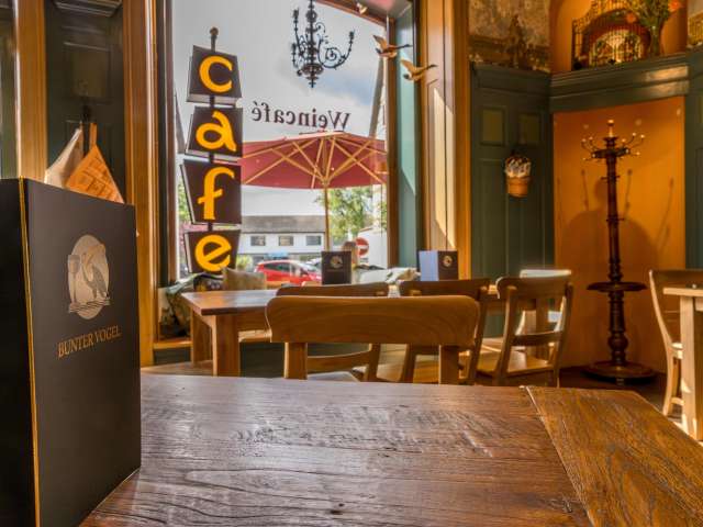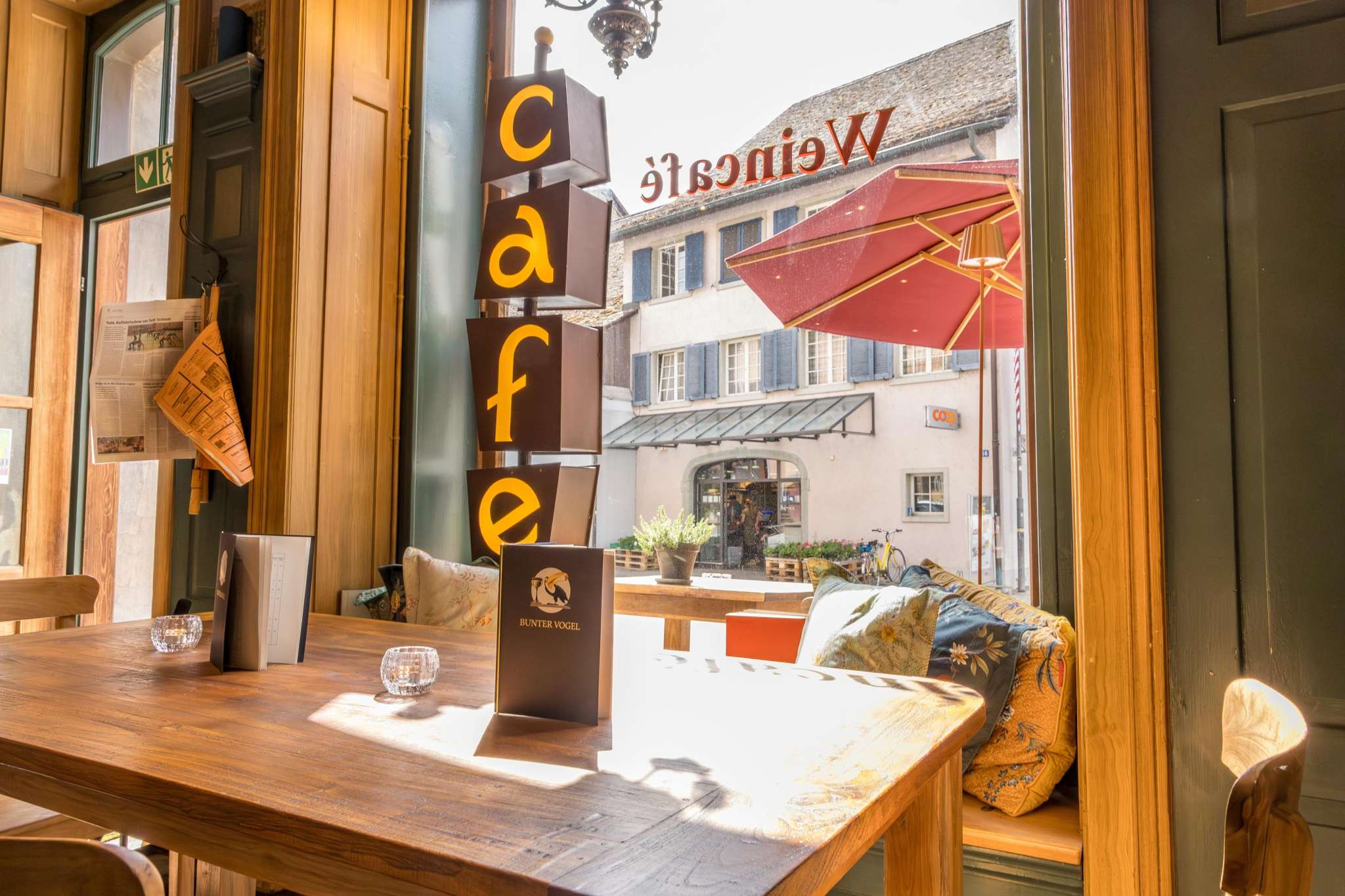 Welcome to the Bunter Vogel wine café - a place to savour and linger The Bunter Vogel wine café, nestled in the charming Haus zum Falken, is an enchanting addition to the historic inn. The lovingly designed dining room invites you to leave the hustle and bustle of everyday life behind and offers the ideal place to linger, savour and return. Host Bruno Agostinho ensures that you feel completely at ease: With a fine selection of regional wines, exquisite drinks, snacks, coffee and cake, there is something for every taste.