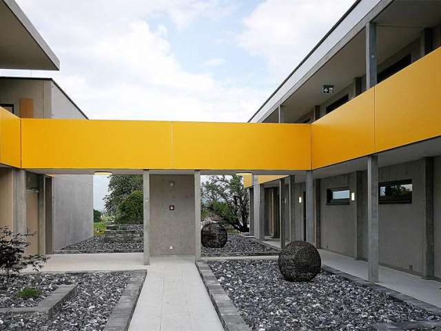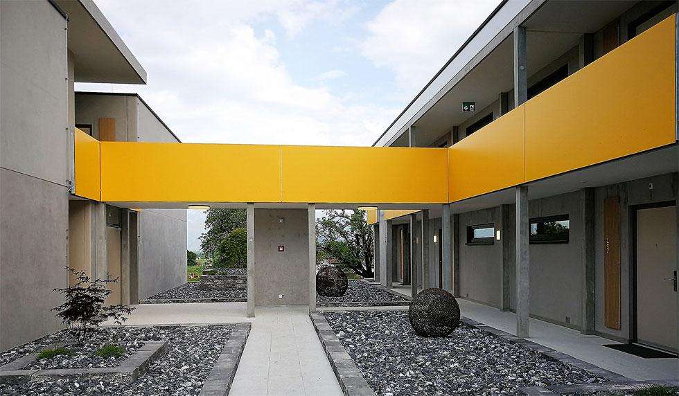 The wohnMOTEL consists of two buildings, each with two storeys and a central underground car park as well as storage rooms on the lower level. There are 31 one-room apartments in one building. The second building has 8 two-room apartments. The two buildings are connected by a passageway for access.