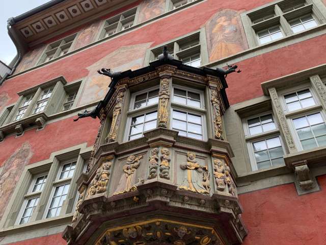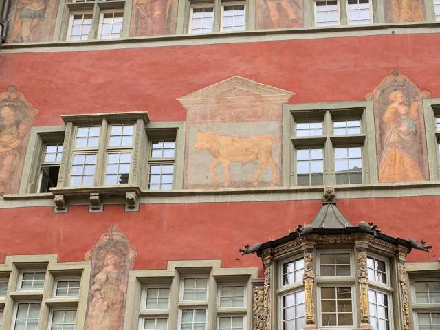 17th century. One of the most grandiose houses of old Schaffhausen, on the site of the old cattle-market. It served until 1608 as a guest house. During remodelling in 1608 into a distinguished town house the late-Gothic façade received some of the splendour of the German Renaissance in the form of bay and portico. The frescoes on the façade show a golden ox as house symbol and personages from Babylonian history and ancient Greece. Above all the heroes of the Trojan war are represented.